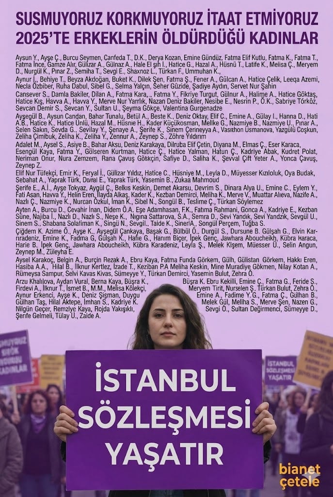 2025 yılında Türkiye genelinde gerçekleşen olaylara dair bianet’in derlediği verilere göre, erkekler en az 299 kadını ve 64 çocuğu öldürdü. Ayrıca 1168 kadını seks işçiliğine zorlayan erkekler, 201 kadına da tacizde bulundu.