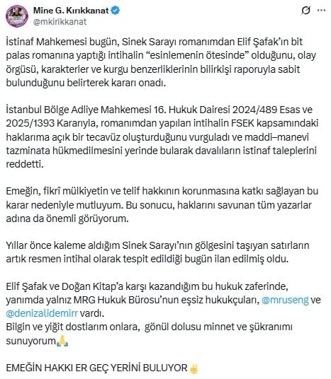 “İstinaf Mahkemesi bugün, Sinek Sarayı romanımdan Elif Şafak’ın bit palas romanına yaptığı intihalin ‘esinlemenin ötesinde’ olduğunu, olay örgüsü, karakterler ve kurgu benzerliklerinin bilirkişi raporuyla sabit bulunduğunu belirterek kararı onadı.