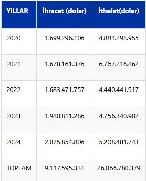 Bu rakam, 2023’te 1 milyar 980 milyon 811 bin dolara çıktı. İhracat, geçen yıl ise 2 milyar 75 milyon 855 bin dolar olarak gerçekleşti.